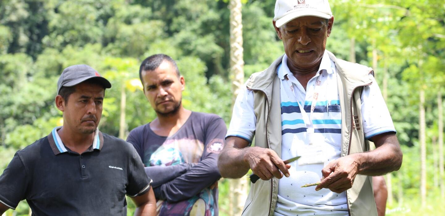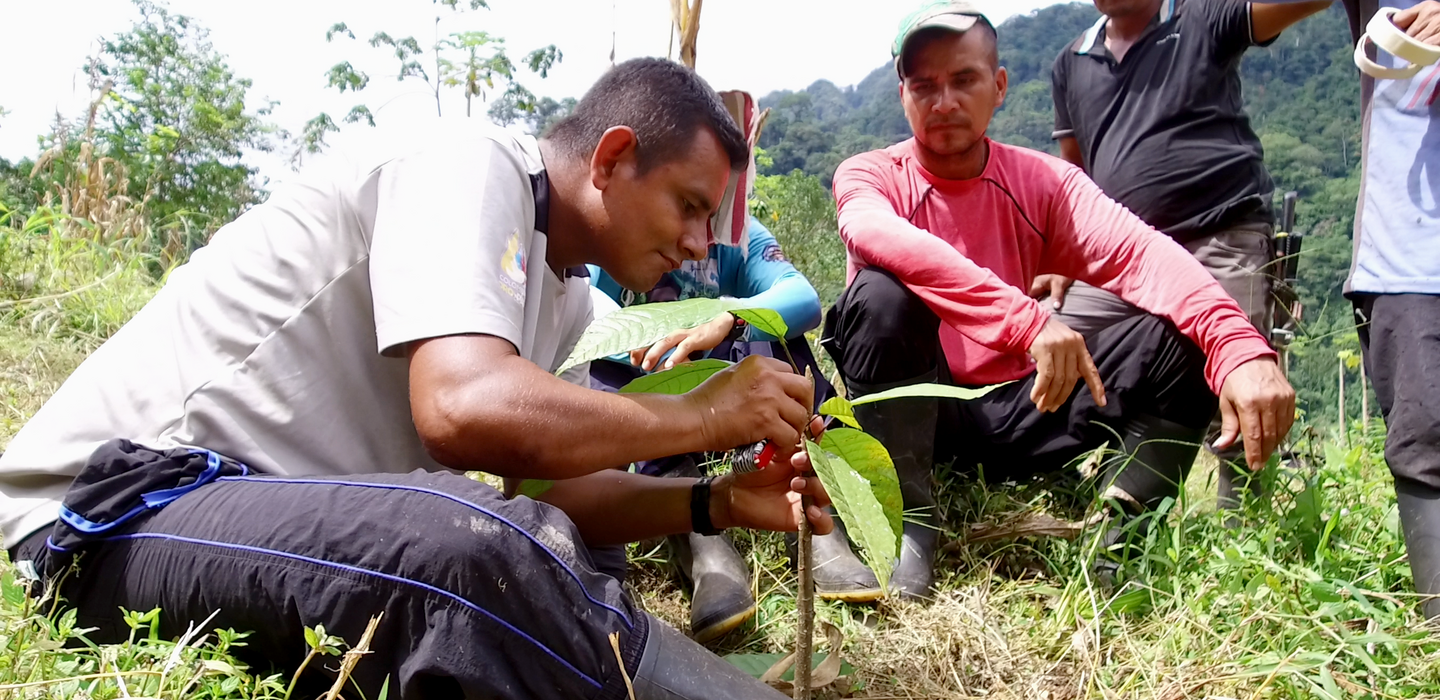 Uno de los primeros proyectos establecidos fue el cultivo de cacao en cuatro hectáreas de la finca. Si bien este cultivo apenas se encuentra en establecimiento, ha sido significativo para los participantes el manejo agroecológico que ha tenido y las capacitaciones tecnológicas que mensualmente reciben. Para continuarlo, se prevé realizar encuentros de intercambio campesino y técnico con la Asociación de Cacaoteros de Dabeiba y FEDECACAO, para consolidar el manejo ecológico del cultivo y su posterior comercialización.