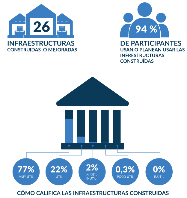 En alianza con entidades gubernamentales y empresas privadas, las comunidades socias del plan construyeron 10 infraestructuras nuevas y mejoraron otras 16, para un total de 26 obras priorizadas por las comunidades como de la mayor importancia para potenciar los activos productivos con que contaban, como las asociaciones y proyectos productivos locales. Estas obras les permitirán desempeñar tareas comerciales, agrícolas o turísticas, en ambientes adecuados y con una mayor eficiencia técnica, dinamizando así cadenas de valor alternativas y legales en los territorios: