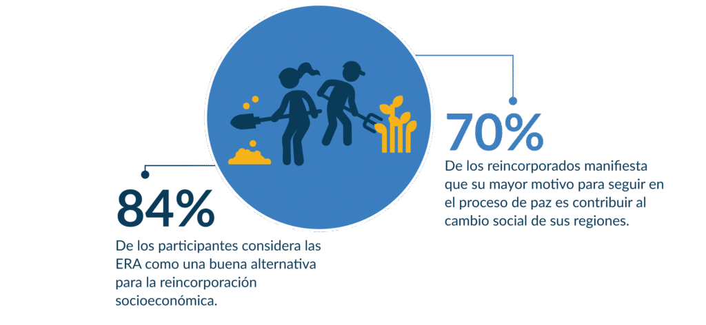 En este contexto las ERA se han consolidado como plataformas de integración de actores mediante diálogos, trabajo colaborativo diario y objetivos priorizados a largo plazo mediante procesos de concertación colectiva. En su conjunto, las ERA han propiciado la creación de lazos comunitarios entre sus participantes: el 76% de los miembros de la comunidad sienten que su relación con los reincorporados ha sido positiva o muy positiva, el 83% de los campesinos se siente cómodo teniendo un reincorporado como vecino y un 70% reporta que es parte de algún proyecto productivo con reincorporados.