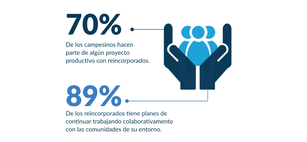 En las comunidades que han surgido gracias a los espacios de las ERA, la reincorporación social se traduce en la reducción de las estigmatizaciones, divisiones y otros obstáculos para la integración entre los diferentes actores. El 89% de los reincorporados indica que tiene planes de continuar trabajando colaborativamente con las comunidades de su entorno y el 91% de ellos se siente satisfecho con el restablecimiento de sus lazos familiares.