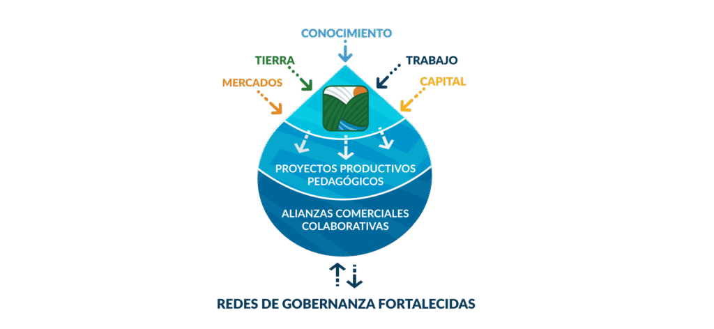 El modelo de las ERA busca articular de forma colaborativa cinco componentes fundamentales para la sostenibilidad de los proyectos productivos priorizados con las comunidades: mercados, tierra, conocimiento, trabajo y capital. Por su parte, los participantes encuestados coinciden en que los apoyos más importantes para su proceso de reincorporación son: tener tierra propia (85% de importancia), participar de proyectos productivos (82%), y lograr la comercialización de sus productos (80%). El enfoque colaborativo y de trabajo en red ha demostrado ser efectivo para superar obstáculos como la falta de tierra o de acceso a mercados. Además irradia sus beneficios en las comunidades circundantes.