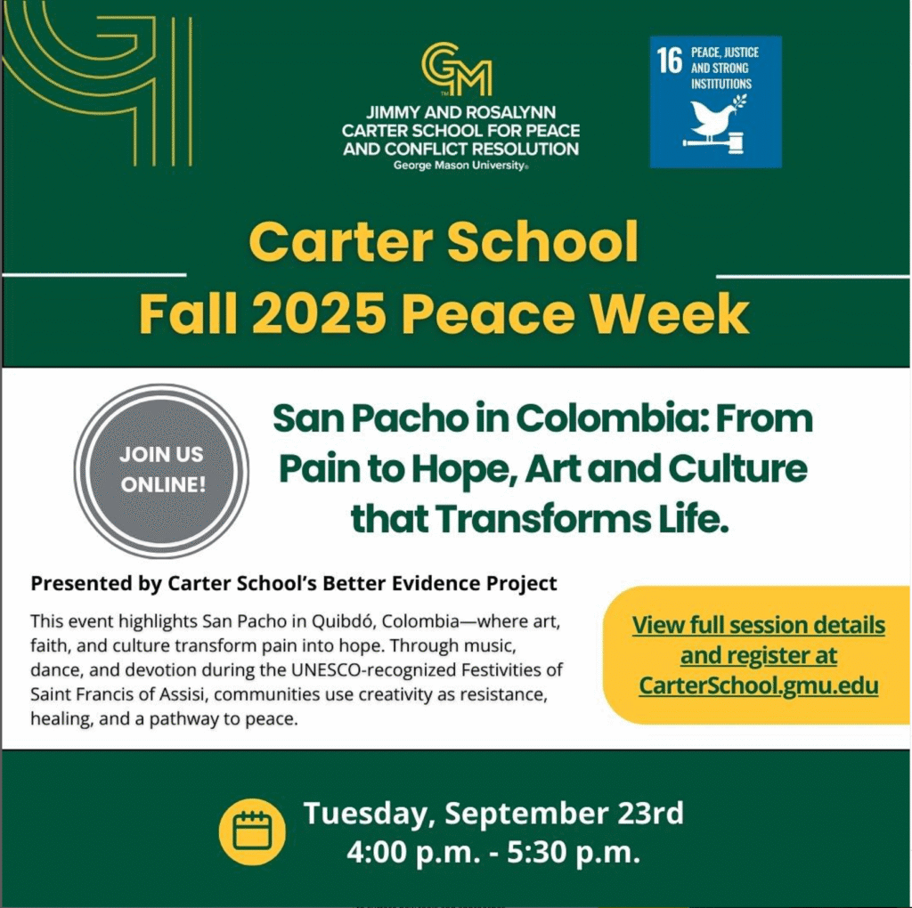 El próximo martes 23 de septiembre de 2025, de 3:00 PM a 4:30 PM (COT), se realizará el evento virtual “San Pacho en Colombia: Del dolor a la esperanza, arte y cultura que transforma vida”, una iniciativa presentada por el Proyecto Better Evidence (BEP) de la Escuela Carter para la Paz y Resolución de Conflictos.